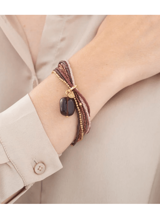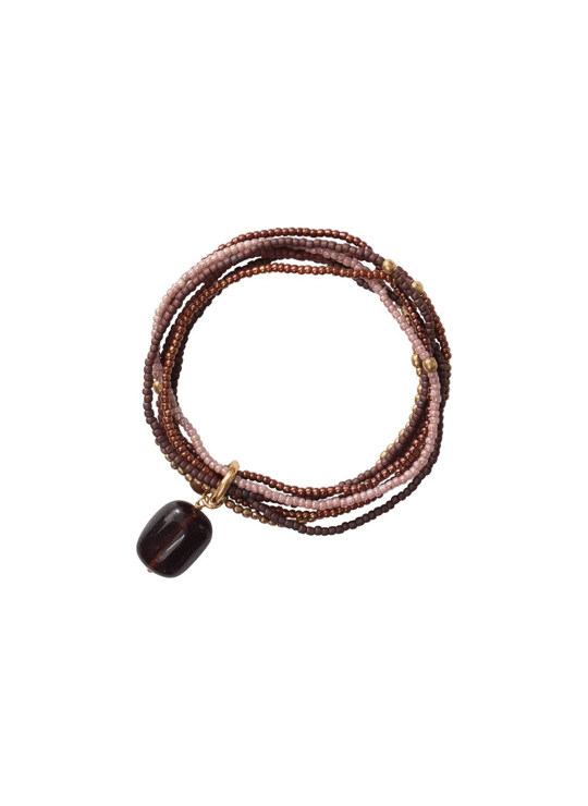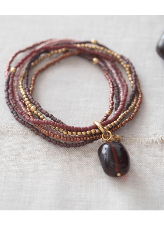 Handgemaakte elastische armband van gekleurde glaskralen en vergulde messingkralen geregen op elastiek. De zeven strengen worden samengehouden door een handgemaakte ring met daaraan een edelsteen.