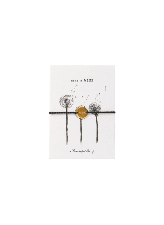 Dit kaartje heeft een unieke zwart-wit illustratie van drie paardenbloemen en de tekst "make a wish". De armband is gemaakt van katoenen waxdraad en een goudkleurig, handgemaakt muntje met het woord "wish" erin gegraveerd.