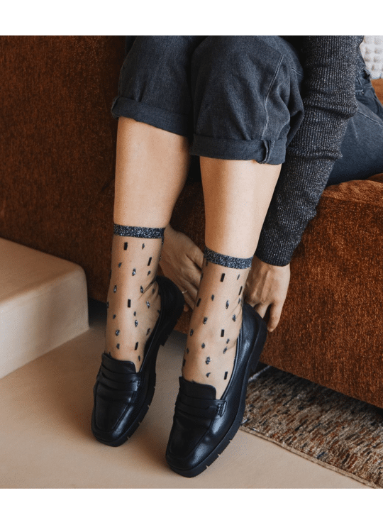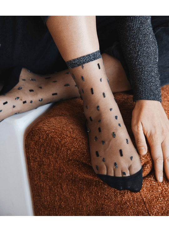 Deze glinsterende stippensokjes zijn ontworpen in samenwerking met het Franse schoenenmerk Reqins. De perfecte finishing touch om een zwarte broek of eenvoudige jeans extra punch te geven. Draag ze met sneakers, pumps of loafers. Altijd stijlvol.
