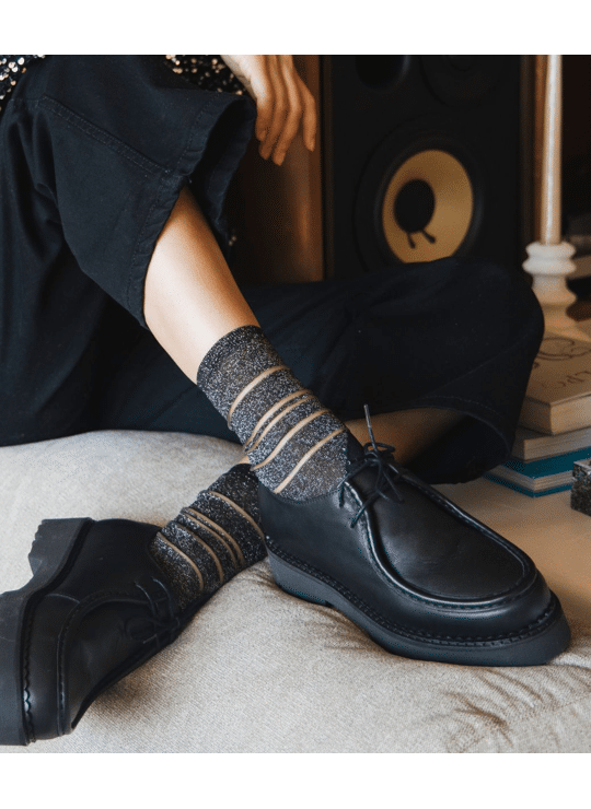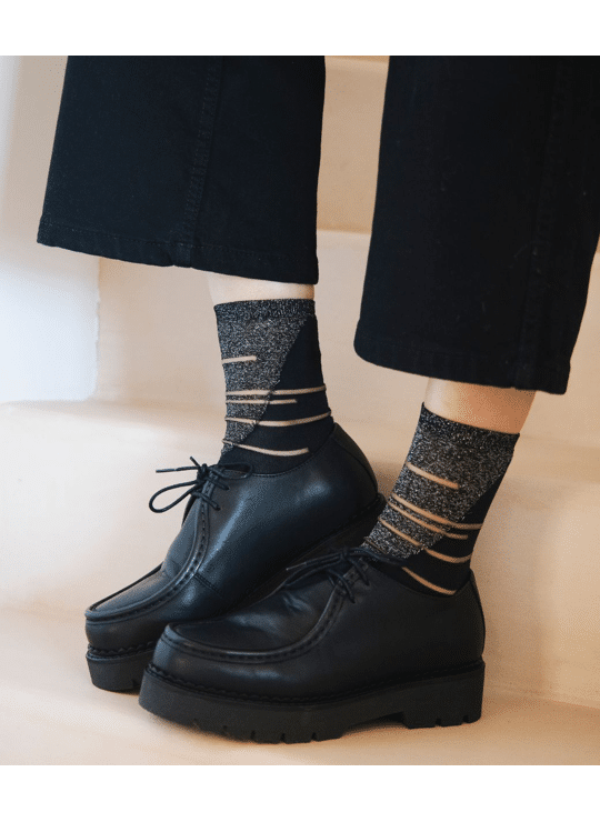 Van een elegante zwarte broek tot een casual jeans, van loafers tot pumps: deze sokken kousen met transparante details en een vleugje glitter draag je zowel naar kantoor als voor feestelijke momenten. Het ontwerp is geïnspireerd op het iconische Tate Modern museum in Londen.