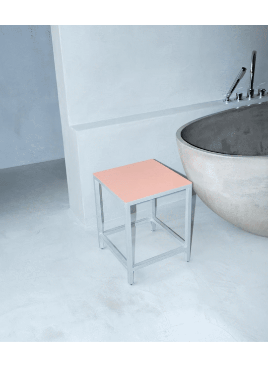 De kruk is gemaakt van aluminium met een gelakte zitting, en komt in drie hoogtes en vier frisse kleuren: ivoor, groen, alu en roze.