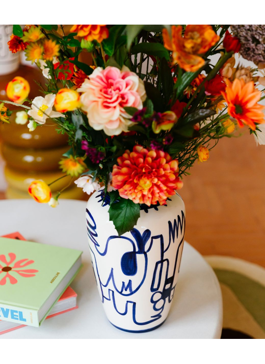 Prachtige met de hand beschildere vaas uit keremiek van Val Pottery in samenwerking met Julie Loeckx, gekend voor haar grafische ontwerpen boordevol kleur. Een echt collectors item boordevol karakter, zorgvuldig verpakt in een stijlvolle geschenkdoos.