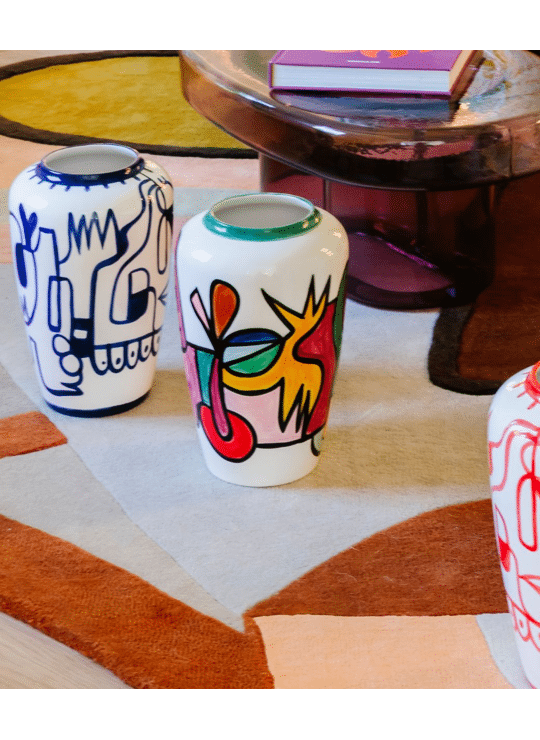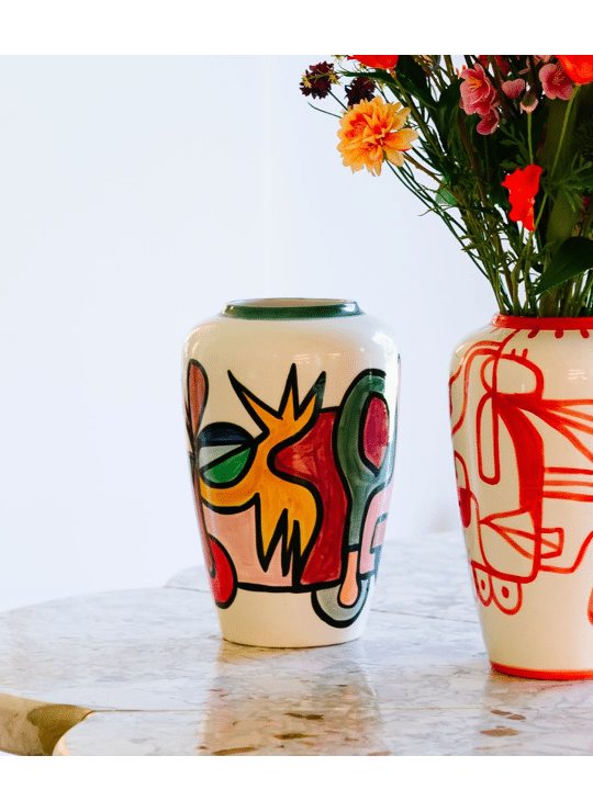 Prachtige met de hand beschildere vaas uit keremiek van Val Pottery in samenwerking met Julie Loeckx, gekend voor haar grafische ontwerpen boordevol kleur. Een echt collectors item boordevol karakter, zorgvuldig verpakt in een stijlvolle geschenkdoos.